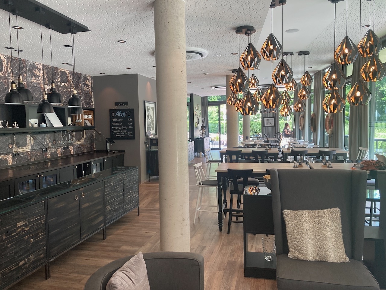 Die attraktive zentrale Hotel-Lage am Seerhein in direkter Nachbarschaft zum Herosé-Park eröffnet außergewöhnliche Perspektiven auf den Bodensee. In unserem modern interpretierten, maritimen „Wohnzimmer“ – Herzstück und Treffpunkt im HARBR. hotel Konstanz – lässt sich der mondäne Ausblick nach Lust und Laune genießen. Ob spontane Gelüste oder Bärenhunger, Frühstückskaffee oder Feierabendbierchen – unser heimeliges Wohnzimmer liegt kulinarisch irgendwo zwischen Lieblingsrestaurant, Snackbar und „Die kleine Kneipe in unserer Straße“. Auf jeden Fall liegt man hier immer goldrichtig. Unser universeller Hotel-Treffpunkt bietet köstliche Gerichte, kleine Snacks und großartige Drinks für jeden Geschmack.