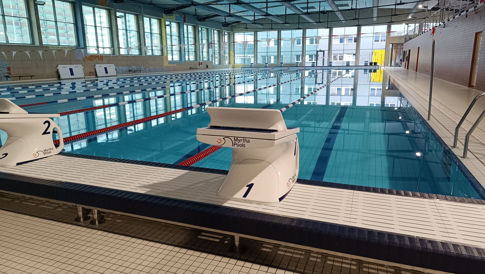 - Zum Einstieg in die Schwimmbecken im Innenbereich gibt es eine Leiter mit Handlauf.