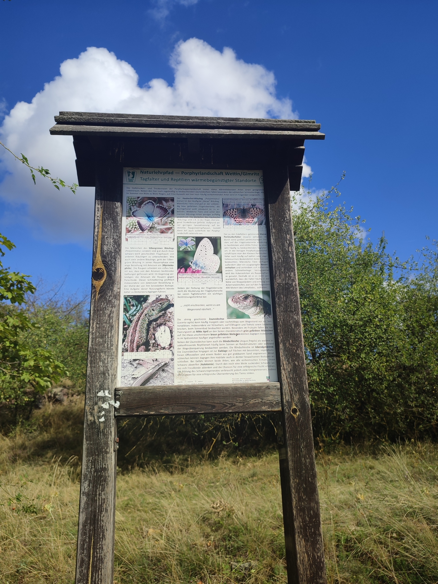 Der 2017 eingeweihte Naturlehrpfad erschließt dem Besucher einen besonders charakteristischen Landschaftsraum des Naturparks Unteres Saaletal. Auf dem 2,5 km langen Rundweg, der gut für Familien geeignet ist, kann die einzigartige Porphyrlandschaft im Raum Wettin/Gimritz erkundet werden.