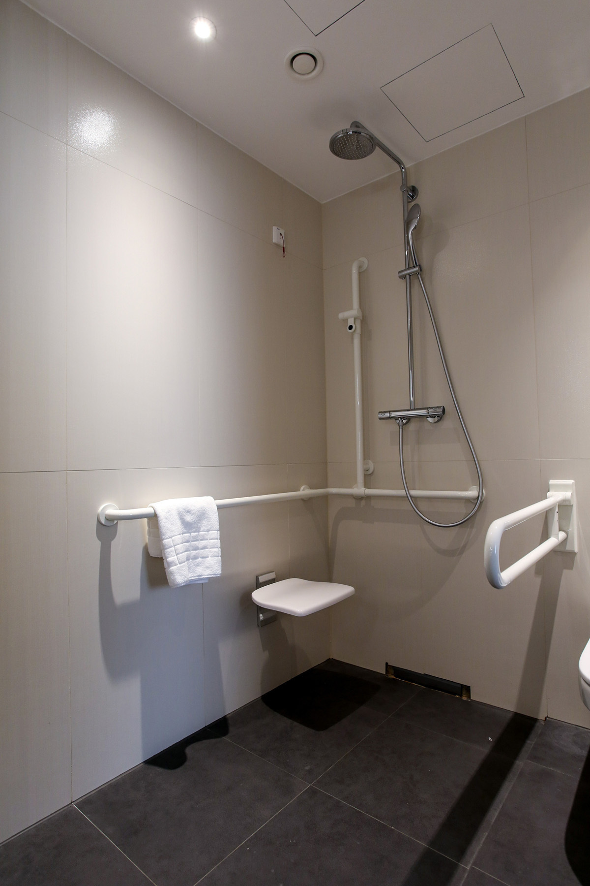 - Der Zugang zur Dusche erfolgt schwellenlos. Ein Haltegriff und ein Duschstuhl sind vorhanden.