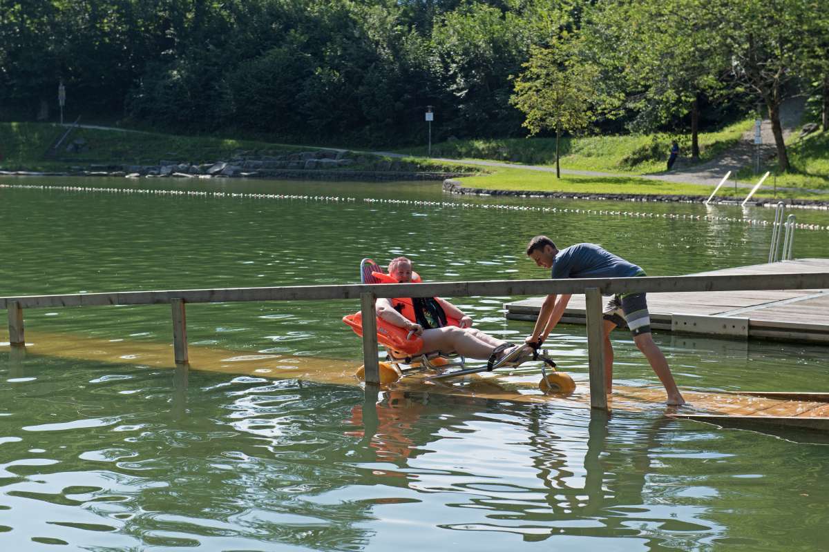 Nach der Wanderung lockt ein Sprung ins kühle Nass und Entspannung auf der großzügigen Liegewiese. Strandrollstühle ermöglichen Menschen mit Mobilitätseinschränkung Badevergnügen. Der Zugang ins Wasser ist über eine Rampe möglich und die Strandrollstühle können kostenfrei ausgeliehen werden. Sie halten sich mithilfe zweier Schwimmkissen, die seitlich am Rollstuhl befestigt sind, über Wasser und ermöglichen ein Eintauchen bis zum Oberkörper. Das Wechseln der nassen Kleidung ist im Anschluss in einem barrierefreien Umkleidehäuschen am See möglich. Ein Beachvolleyballfeld und ein Kiosk sorgen für Abwechslung und kulinarischen Genuss.
